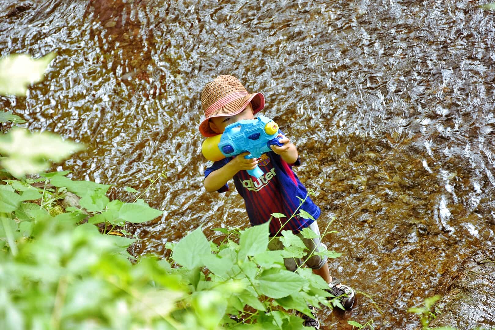 一群小孩子在清澈的溪水中嬉戏打闹,很有童趣