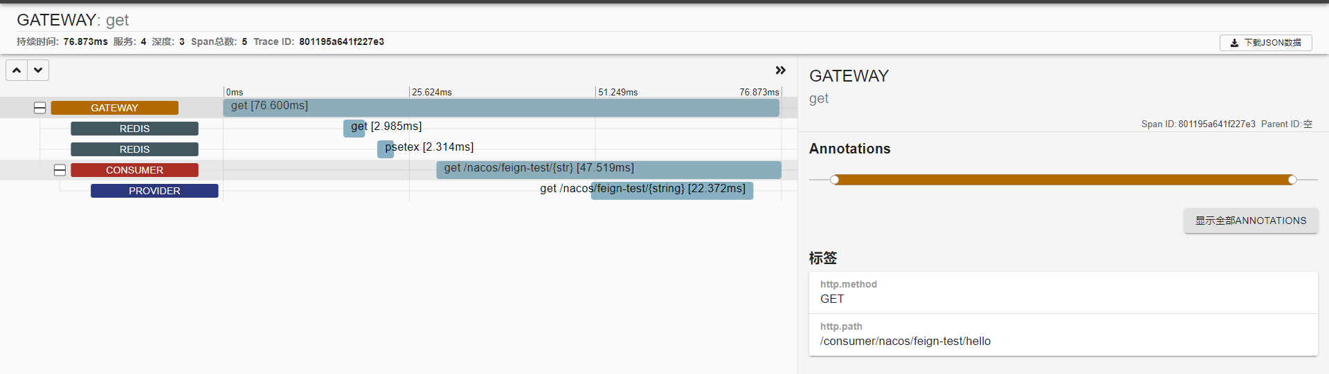 可以看到整个请求链路的过程关系,以及请求的耗时等信息。